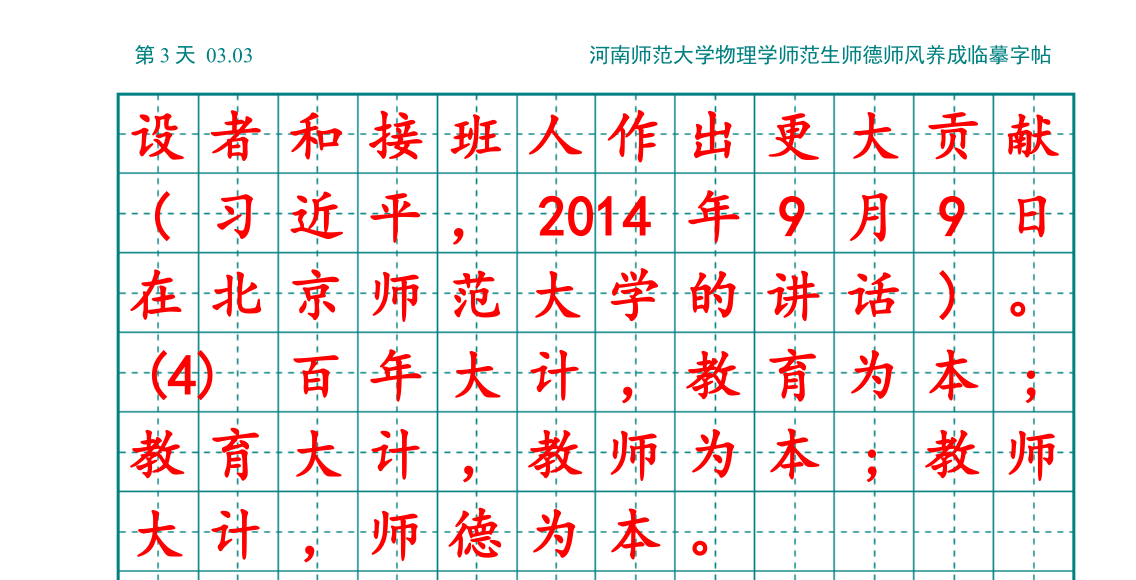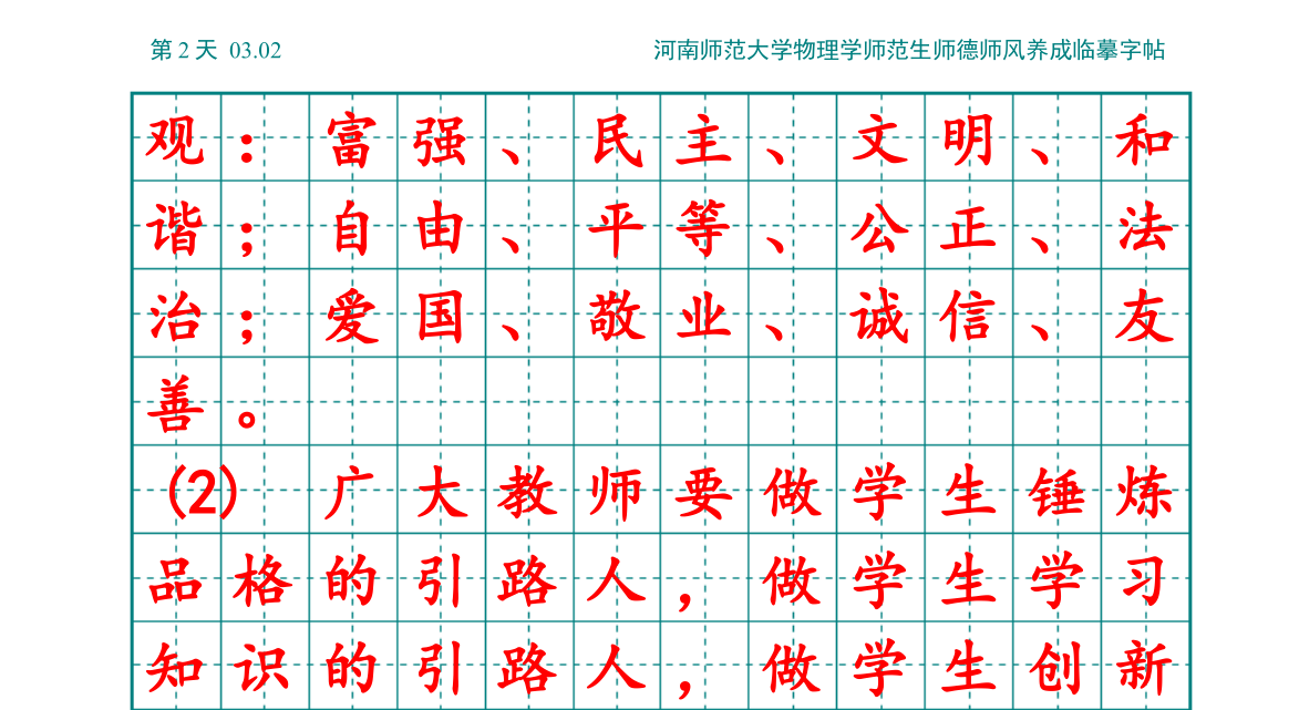 为促进师范生的品格培养和职业道德养成,迎接物理学专业的师范专业认证工作,我院在精心筹备之后于3月1日起正式启动“师德师风养成”硬笔字帖临摹日常练习计划。