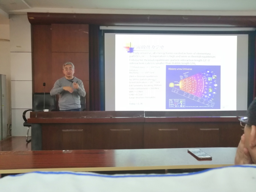 何小刚教授以《宇宙中极小与极大的统一》为题,向师生介绍了宇宙的本身及其发展如何提供可能新粒子和他们怎么相互作用,以及更多地了解基本粒子特性如何提供更多宇宙的特性的讯息。在报告中他指出宇宙中的极大-宇宙本身,与宇宙中的极小-基本粒子,看起来好像是非常不同且不相关的两个极端。现代宇宙学和粒子物理理论表明其实他们是密切联系在一起的,宇宙存在的形式及其演化决定于宇宙中有什么样的基本粒子的存在,早期宇宙是所有基本粒子表现的极佳场所。