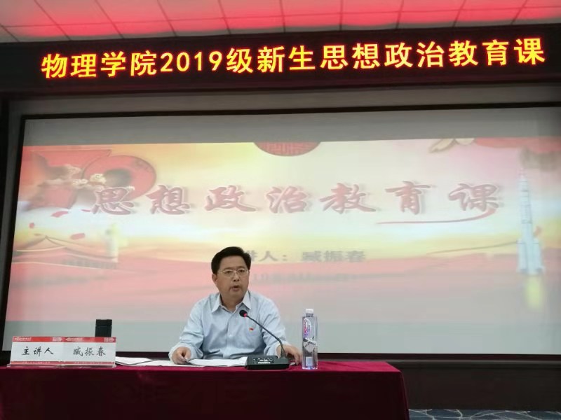 9月24号晚上,校党委副书记、工会主席臧振春在物理北楼三楼报告厅为我院2019级新生讲授思想政治教育课。我院领导班子、教师代表以及2019级全体新生共300余人聆听讲授。讲座由我院党委书记李清富主持。