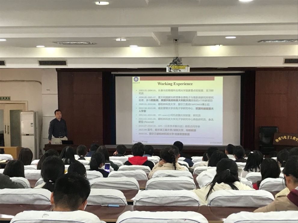 10月15日上午,应物理学院邀请,哈尔滨工程大学王鹏飞教授来我校讲学。报告会在物理南楼二楼报告厅举行。学院相关专业教师、研究生、本科生100余人参加了报告会。