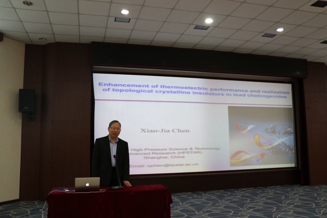 陈晓嘉研究员依次向大家详细介绍了热电材料的性能及其研究现状,就拓扑绝缘顺序、热电和超导电性之间的相互作用、PbSe和PbTe电阻率的巨大变化等问题展开详细叙述。通过选择Cr掺杂的PbSe和In和I双掺杂的PbTe两种体系,研究了压力对这些材料热电行为的影响,发现了两者的室温热电优值在3 GPa 和5 GPa时可分别达到1.7 和3.0 附近。磁阻、霍尔效应、拉曼光谱、密度泛函计算支持在上述临界压力时发生了拓扑相变,从而导致热电表现增强,而后两个体系都进入了新的拓扑晶体绝缘态。这些发现不仅提供了增强热电优值的新方法,显著提高了材料的热电表现,也获得了实现拓扑绝缘体的新途径。最后陈晓嘉研究员向母校表达了谢意,感谢母校的培育之恩。