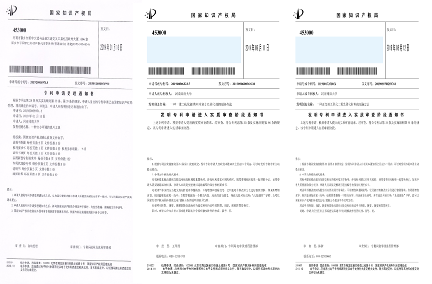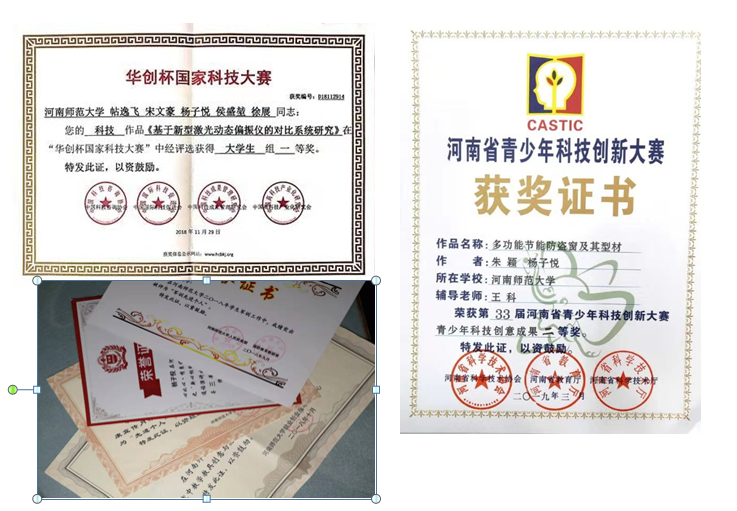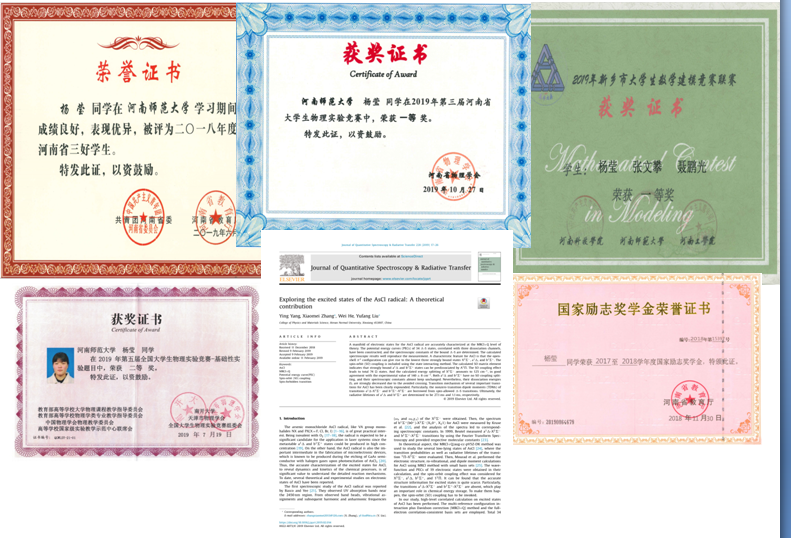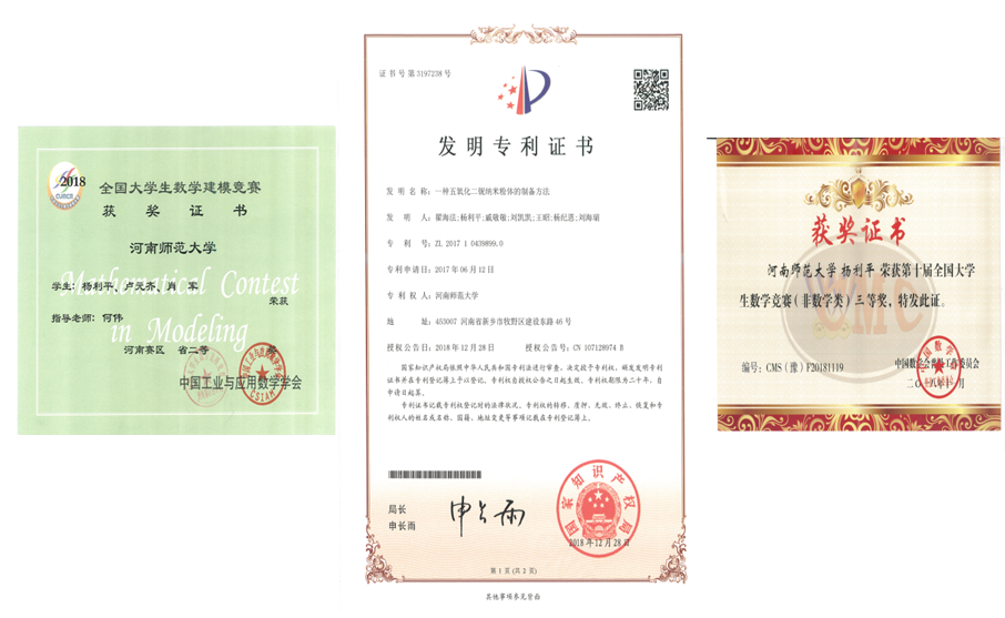 三年下来,每年的专业成绩以及综合测评都在本专业排名第一,多次获得“三好学生标兵”和“优秀团员”的荣誉称号,获得两次国家励志奖学金,一次国家奖学金以及学习竞赛单项奖学金和科技创新单项奖学金等,同时英语四六级也顺利通过;大一下学期进实验室,跟着导师做课题,在大三结束时,发表三篇国家发明专利(《一种五氧化二铌纳米粉体的制备方法》、《一种正交相五氧化二铌光催化材料的制备方法》、《一种一维二硫化钼纳米棒复合光催化剂的制备方法》)和一篇实用新型专利(《一种大小可调的洗片工具》);同时也积极参加竞赛来提高自己的能力,如参加第十届全国大学生数学竞赛(非数学类)获得省级三等奖,2018全国大学生数学建模比赛获得省级二等奖,新乡市数学建模联赛获得市级二等奖,第四届中国“互联网+”全国大学生创新创业比赛获得省级二等奖,第五届中国“互联网+”全国大学生创新创业比赛获得省级二等奖,第十四届“挑战杯”河南省大学生课外学术科技作品竞赛获得省级三等奖等。