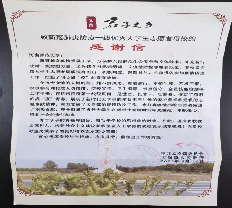 疫情发生以来,我院落实立德树人根本任务,不断强化学生思想引领,积极挖掘学生中的典型事迹,引导学生在各级党委政府的统一领导下,在抗击疫情这场战争中,坚定理想信念,把灾难当教材,与祖国共成长。自2020年以来,我院先后收到不同地区感谢信、表扬信,在今年7月抗击水灾中,我院学子苏雨组建志愿队向卫辉等受灾地区捐赠物资,留校学子主动参与到学校志愿活动中,在灾难面前,众志成城,迎难而上。今后,学院将继续坚持润物有声的工作理念,聚焦人才培养实际需求,不断加强思想政治教育和价值引领,更好引导学生将青春理想与实践奋斗结合,全面助力学生成长成才。