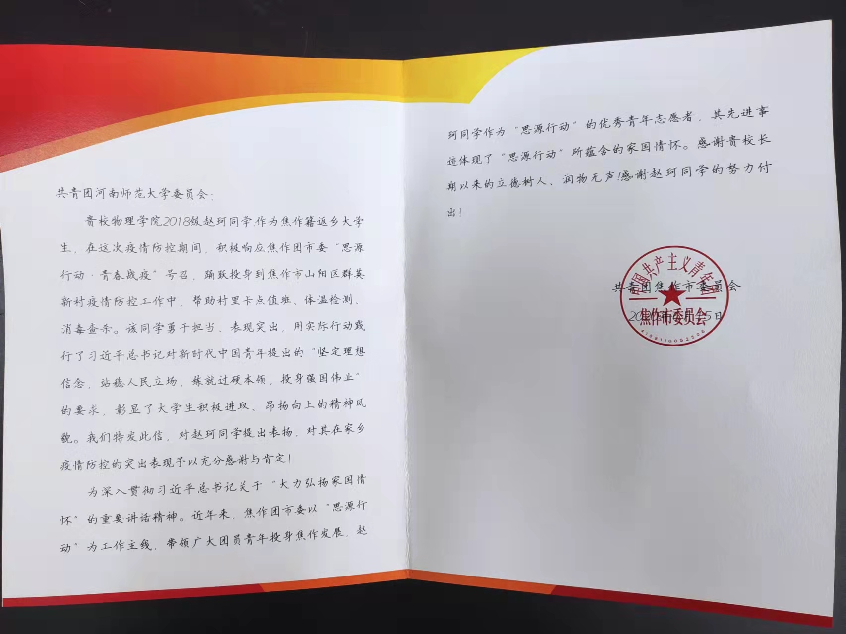 近日,共青团焦作市委、中共孟岗镇委员会分别向我院寄来《感谢信》《表扬信》,感谢疫情防控期间我院2018级物理学专业赵珂、周聪同学勇于担当、挺身而出,在各地防疫工作中贡献自己的青春力量,用实际行动展现了新时代青年学子良好的精神风貌。感谢学院对赵珂、周聪同学等青年学子的培养教育,祝福学院人才培养工作取得更好成绩。