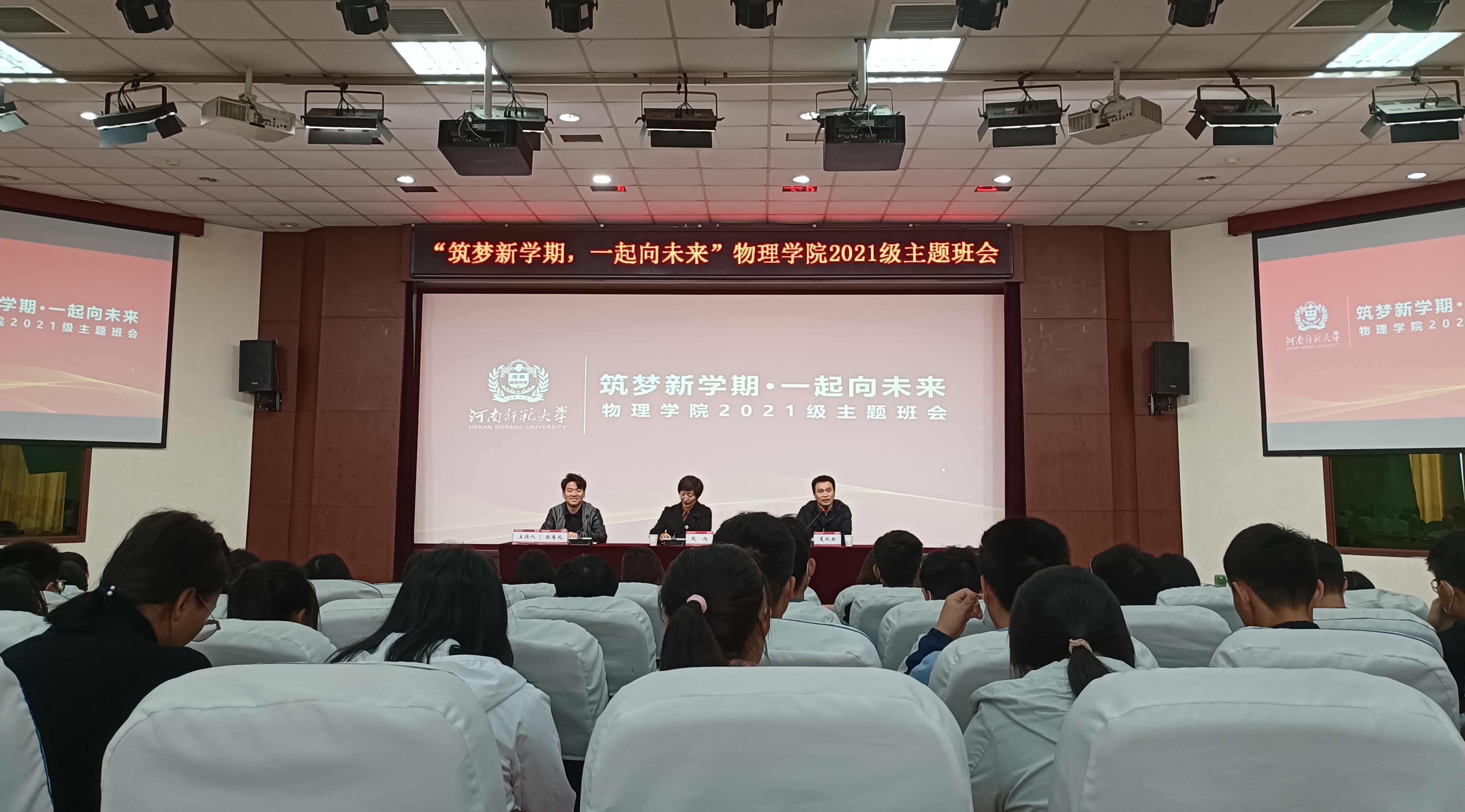 为积极响应党委学工部、学生处在全校开展“筑梦新学期·一起向未来”主题班会的号召,帮助学生尽快从舒适假期模式调整过来,树立清晰目标,明确奋斗方向。物理学院2021级于3月11日在物理北楼三楼报告厅开展“筑梦新学期·一起向未来”主题班会。学院党委副书记赵旭、副院长夏从新、2021级全体学生参加。班会由21级辅导员陈春兆主持。