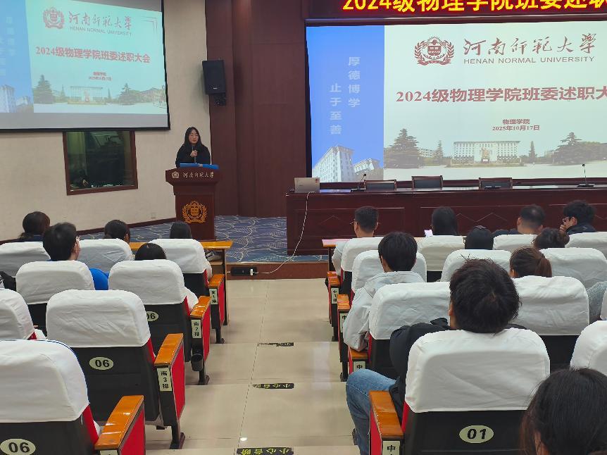 述职复盘明方向,物理学子启新程。10月17日晚,物理学院2024级学生干部述职会圆满召开。2024级辅导员专兼职辅导员、年级委员会成员及2024级全体班委共同出席会议。