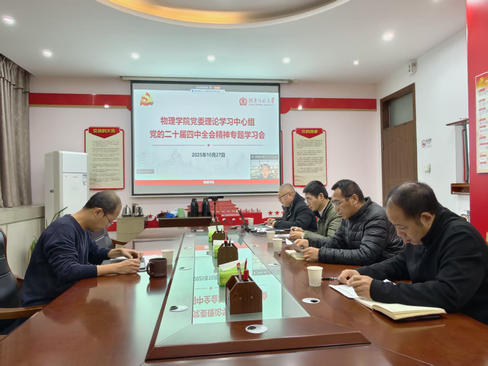 10月27日下午,物理学院在物理北楼A122召开党委理论学习中心组专题学习会,深入学习领会党的二十届四中全会精神。学院党委书记王宁主持会议,中心组成员通过线上线下形式参加学习。