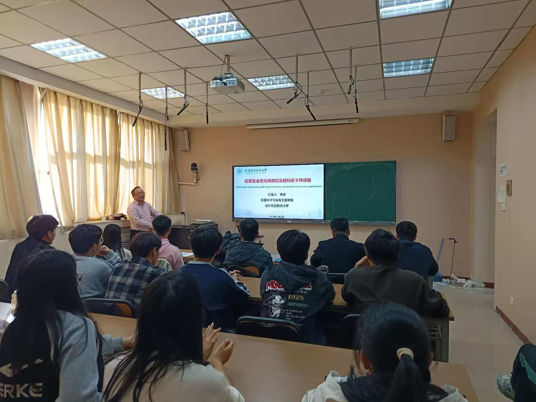 应我校物理学院邀请,北京航空航天大学李进教授来我校进行学术交流和访问。11月1日,在物理南楼217会议室为我校师生呈现了一场精彩的报告,报告题目为 “ 超表面全息光场调控及超构量子传感器”,学院相关专业教师、研究生和本科生参加了此次报告会。