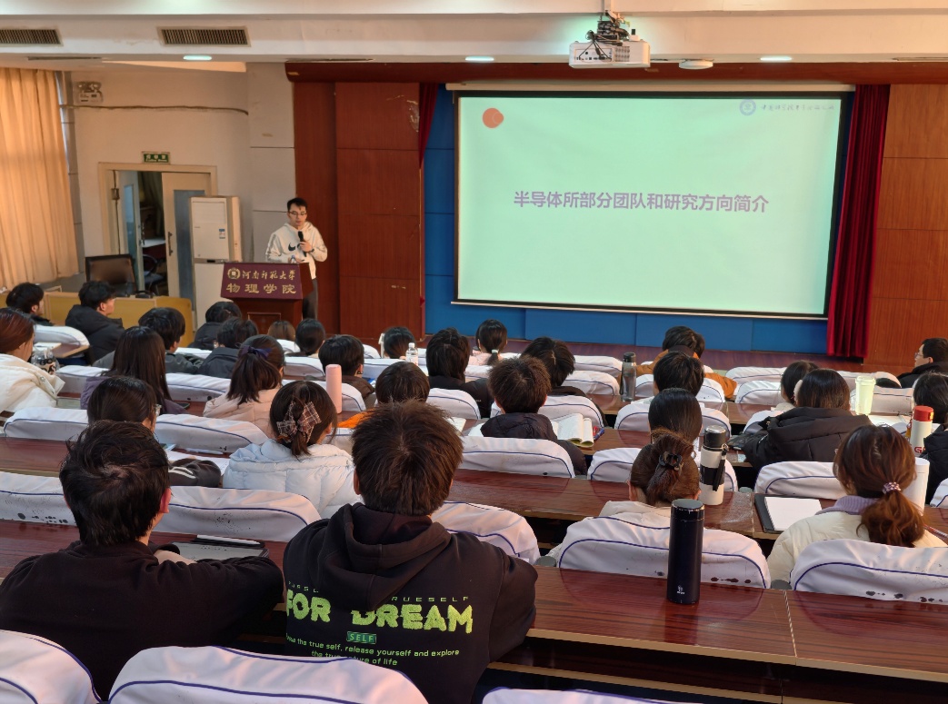 魏钟鸣以“唯实创新 追求卓越”为题为师生作报告。他系统回顾了中国科学院半导体研究所的发展历程与学科渊源,介绍了以我国著名物理学家、半导体物理奠基人黄昆先生命名的“黄昆英才班”建设情况,以及研究所依托中国科学院大学实施科教融合培养模式,开展拔尖创新人才培养的基本情况,并简要介绍了半导体研究所在物理、材料、器件、集成电路及人工智能等方向取得的研究成果。他指出,半导体研究具有高度交叉性,物理背景学生在相关研究方向中具备坚实基础与广阔发展空间,鼓励同学们在夯实理论功底的同时,主动了解国家需求与学科前沿,积极投身科技强国建设。最后,魏钟鸣和吴江滨结合自身科研与育人经验,就师生关心的拔尖创新人才培养路径、科研方向选择、夏令营参与方式及研究生阶段发展等问题与师生进行了交流互动。
