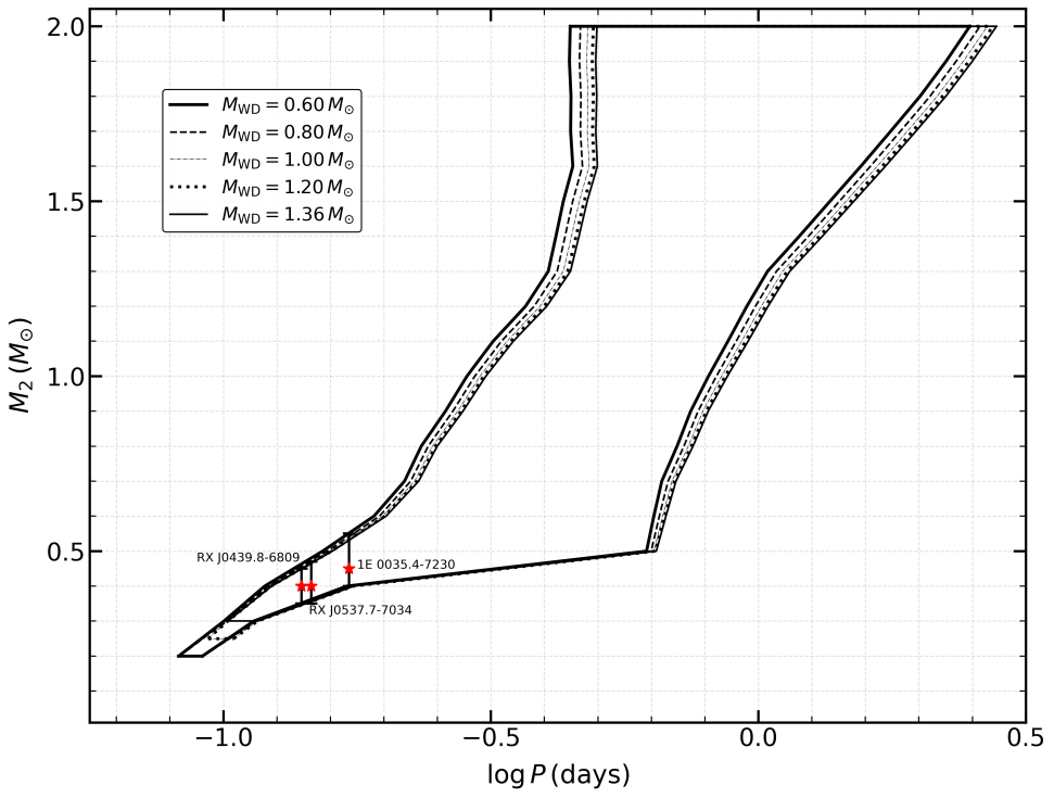 图:新星系统在发生爆发后形成超软X射线源的参数空间。红色标记代表目前已发现的短周期超软X射线源以及可能的伴星质量范围。