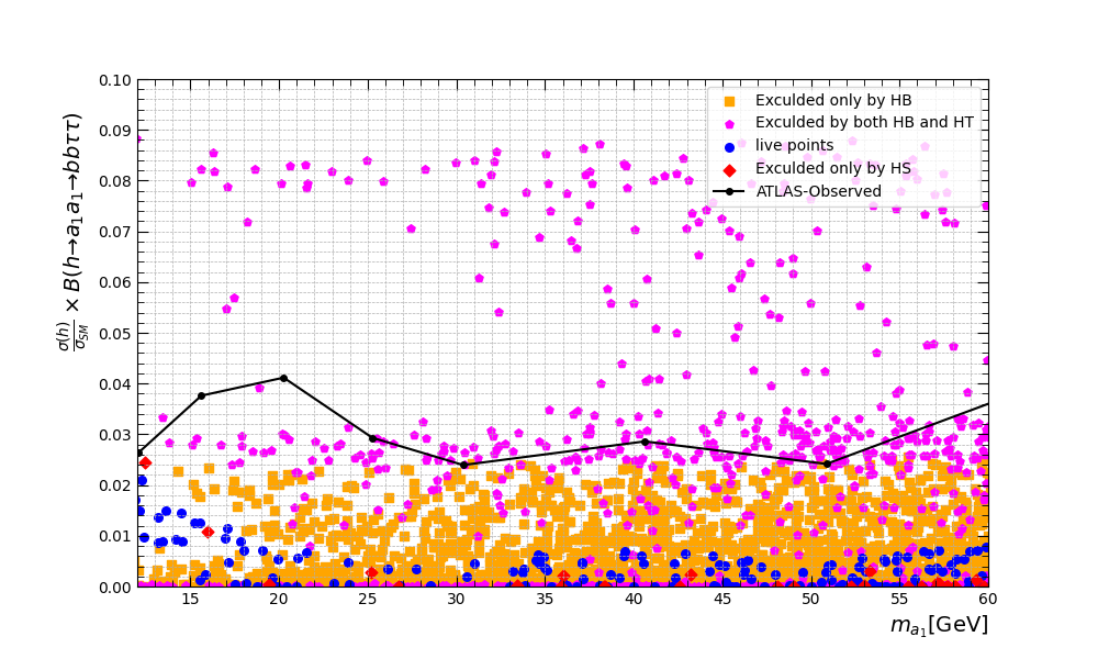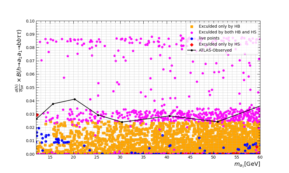 GNMSSM预言了三个CP偶Higgs粒子和两个CP奇Higgs粒子的存在。其中,最轻或次轻的CP偶Higgs可充当类标准模型Higgs粒子(分别对应h1和h2情形)。论文系统分析了在这两种情形下,类标准模型 Higgs 粒子衰变至最轻的CP奇 Higgs 粒子(as)的过程。通过程序包HiggsTools施加最新的实验限制,研究发现,HiggsBounds给出的约束最为严格;在h2情形下,HiggsSignals进一步排除了部分分支比 Br(h→asas→bb) <2.5% 的参数空间。此外,暗物质性质分析表明,h1情形下暗物质可以以singlino或higgsino成分为主,而h2情形下则主要由higgsino主导。