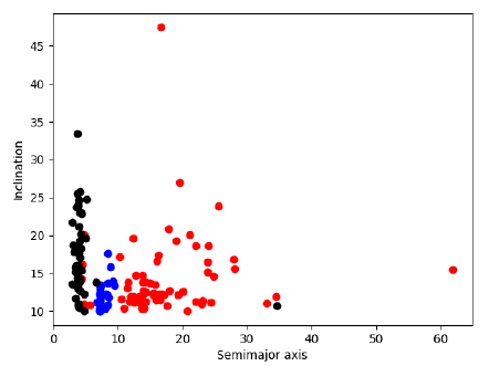 图:幸存月球的轨道倾角(单位为度)随该月球的轨道半长轴(单位为地球半径)的分布。黑点、蓝点、红点分别表示较大质量的月球与地球合并或被弹射出去、两个月球合并、较小质量的月球与地球合并或被弹射出去。