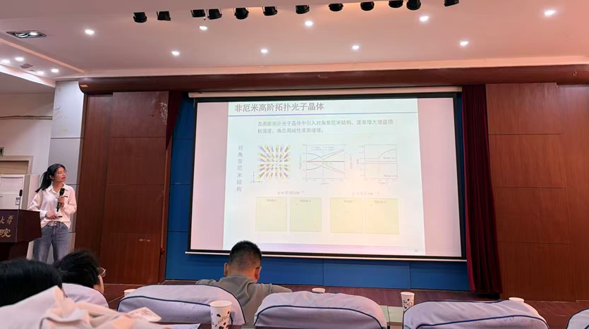 报告中,康娟研究员围绕拓扑光子绝缘体的光场调控机制与应用潜力展开阐述。她首先介绍了拓扑光子绝缘体凭借新颖的光场调控机制和光操控特性,在实际应用中展现出巨大潜力;高阶拓扑光子绝缘体的出现进一步拓展了研究维度,其边缘态和角态具备更强的光局域与拓扑保护特性,为微纳集成光子器件发展提供了新方向。飞秒激光直写光波导阵列兼具波导形状与折射率可控、可加工二维及三维结构、信号探测简便等优势,是拓扑光子态发现与调控的理想研究载体。基于这一平台,康娟研究员系统介绍了郑州大学团队的系列研究成果,重点讲解了三方面内容:方根拓扑光子晶体的构建与光场调控特性、非厄米高阶拓扑光子晶体的新奇物理效应、可重构非厄米拓扑光子平台的设计与应用,清晰呈现了拓扑光子晶格中光场的传输规律、调控机制及广阔应用前景,让在场师生直观感受到拓扑光子学的前沿魅力与应用价值。