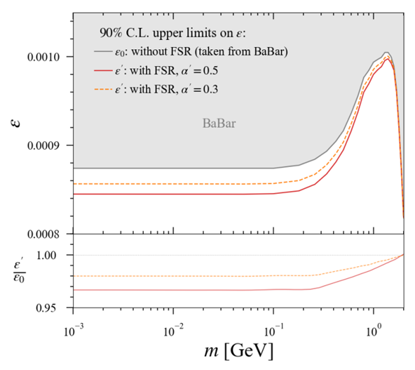 研究表明,暗光子末态辐射暗希格斯会提升信号截面并改变截面的分布。团队重新分析了国际实验组 BaBar 的实验数据,给出了更严格的暗光子排除限(如图-1所示)。该成果可直接应用于暗物质信号预测与数据分析,有效提升实验探测精度,为 Belle II、CEPC 等未来对撞机实验提供了关键理论支撑。未来,团队计划将该方法推广至更高能区以及其他暗区模型。