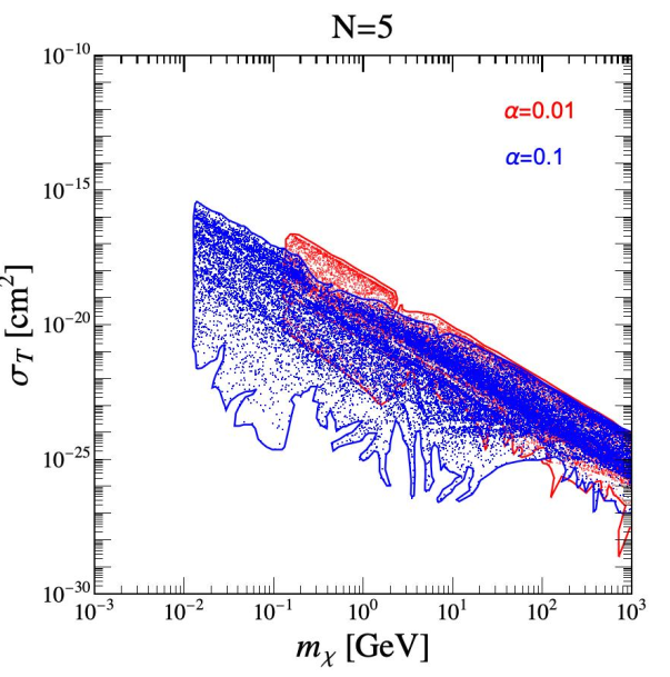 图:有限尺寸暗物质粒子与原子核的散射截面的精确预言,其中横坐标是暗物质粒子的质量,纵坐标是散射截面。