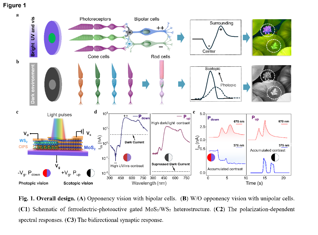 针对传统视觉传感器在强光 / 弱光动态环境下图像对比度骤降、目标识别失效的核心难题,团队创新性提出单器件硬件级自适应视觉方案,构建出基于二维铁电材料CuInP₂S₆(CIPS) 的CIPS–WS₂/MoS₂范德华异质结器件,通过铁电极化精准调控实现全场景高对比度视觉感知。该器件依托 CIPS 室温可切换铁电极化特性,实现强光 / 弱光双模式自适应切换。器件在Pdown负极化状态时,仿生紫外 / 可见光拮抗成像强光环境,韦伯对比度从 0.414 提升至 2.51,花蕊目标识别率由 70% 提升至 87%。弱光场景(极低照度)切换到Pup正极化态,目标识别精度达90%,韦伯对比度提升22.2倍。该成果首次在单器件层面实现生物启发的明暗自适应 + 光谱拮抗双功能,为自动驾驶、机器人视觉、无人机、极端环境智能传感等场景提供低功耗、小型化、高鲁棒性的硬件解决方案,突破传统 CMOS 视觉传感器在动态光照下的性能瓶颈。
