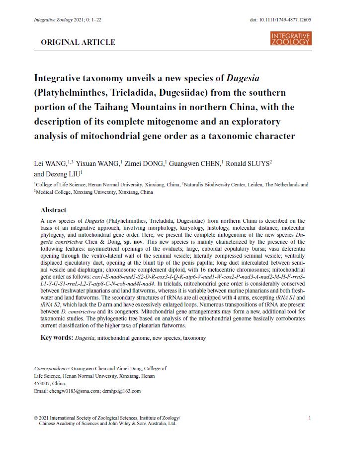 Wang L, Wang Y-X, Dong Z-M, Chen G-W, Sluys R, Liu D-Z. Integrative taxonomy unveils a new species of Dugesia (Platyhelminthes, Tricladida, Dugesiidae) from the southern portion of the Taihang Mountains in northern China, with the description of its complete mitogenome and an exploratory analysis of mitochondrial gene order as a taxonomic character.Integrative Zoology. 2022, 17(6): 1193–1214.