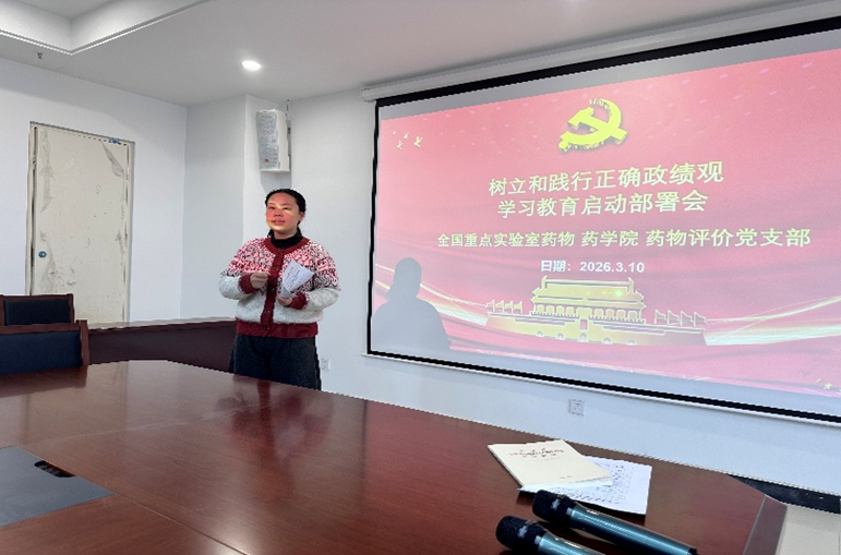 3月10日上午,抗病毒性传染病创新药物全国重点实验室 药学院党委药物评价党支部在全国重点实验室实验大楼E201会议室召开支部全体党员大会,会议主题为树立和践行正确政绩观学习教育动员部署会,学习贯彻习近平总书记关于树立和践行正确政绩观学习教育的重要讲话和重要指示精神,传达校党委和全国重点实验室 药学院党委通知精神,部署本支部学习教育工作。会议由党支部书记田苗苗主持。