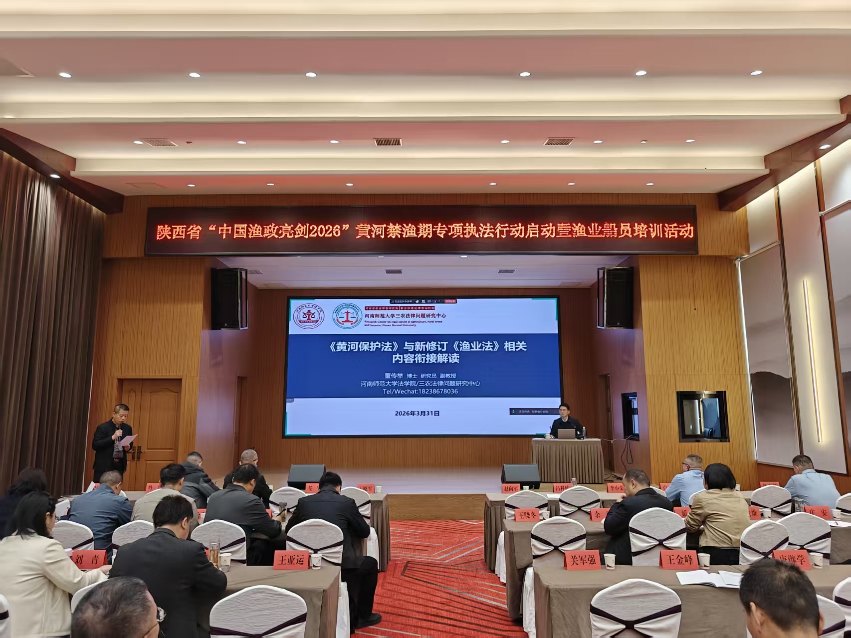 2026年3月31日,陕西省“中国渔政亮剑2026”黄河禁渔期专项执法行动启动暨渔业船员培训活动顺利举办。中心副主任董传举受邀出席,围绕《黄河保护法》与新修订《渔业法》相关内容衔接问题展开专题解读。