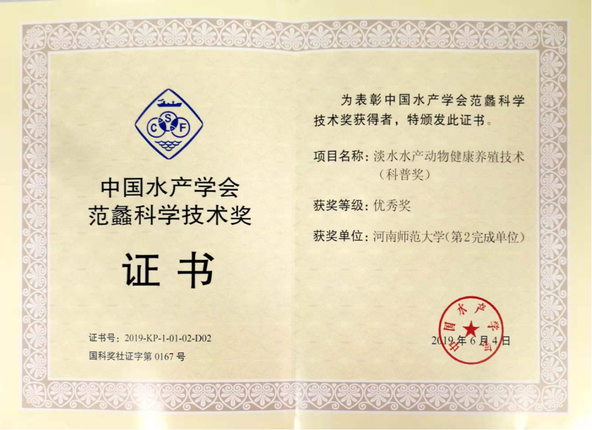 王磊老师获中国水产学会范蠡科学技术奖一等奖
