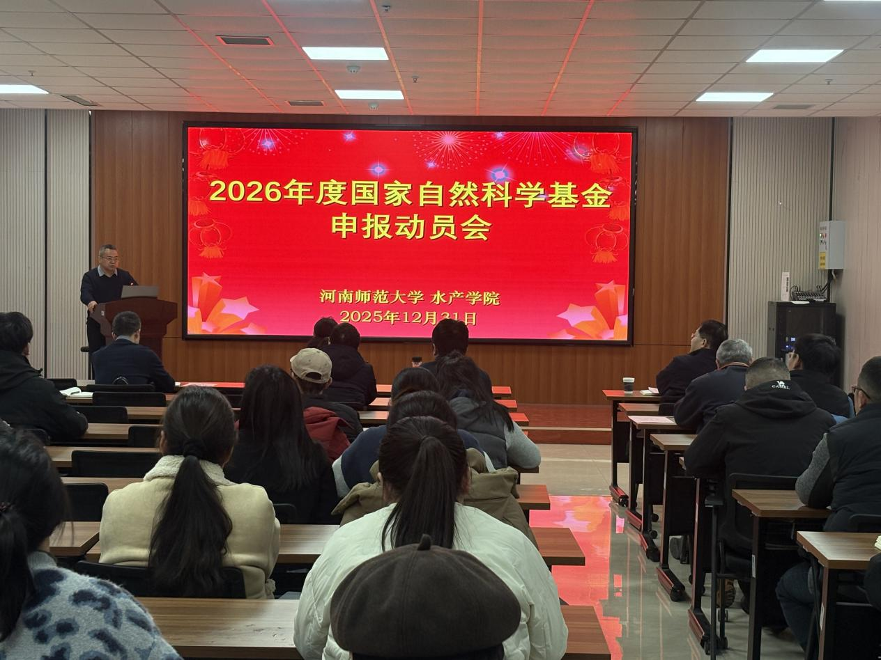 为扎实推进国家自然科学基金项目申报工作,进一步提升学院科研创新能力和基金立项水平,12月31日下午,我院在实训楼203会议室召开2026年度国家自然科学基金申报动员会。校党委常委、副校长、水产学院院长聂国兴,科技处处长仉华、副处长裴永刚出席会议。会议由水产学院党委书记李保华主持,学院全体教师参加。