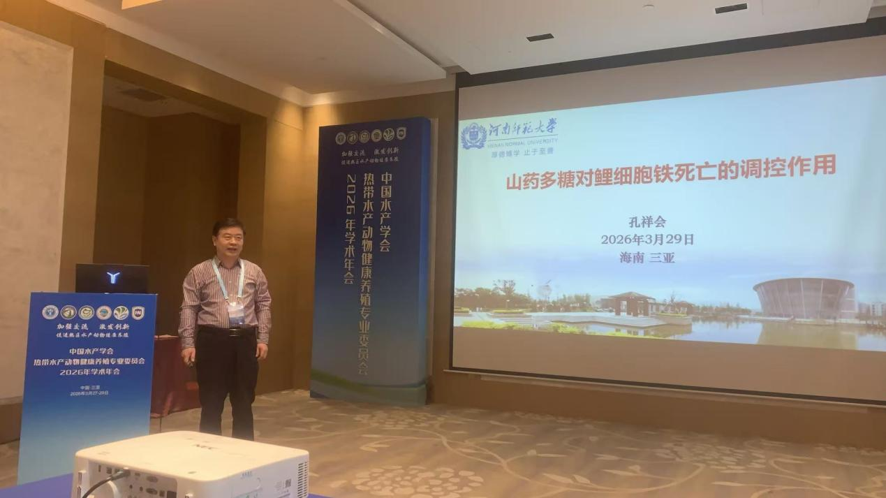 会议邀请国内相关领域的院士、专家学者围绕“加强交流,激发创新,促进热区水产动物健康养殖”主题开展学术交流。大会设立了特邀专家报告、专题报告及研究生论坛,与会专家学者围绕种质资源创新、病害防控新策略、营养饲料、智慧养殖、热带水产养殖绿色发展路径等议题分享了最新研究成果。我院孔祥会教授应邀作了题为“山药多糖对鲤细胞铁死亡的调控作用”的学术报告,并进行了充分的学术交流,取得了较好的学术交流效果。
