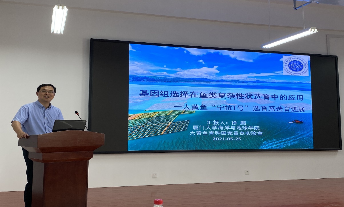 徐鹏研究员以 “基因选择在鱼类复杂性状选育中的应用”为题,介绍了大黄鱼“宁抗一号”选育系选育进展。本次报告加深了我院师生对鱼类复杂性状选育的理解。