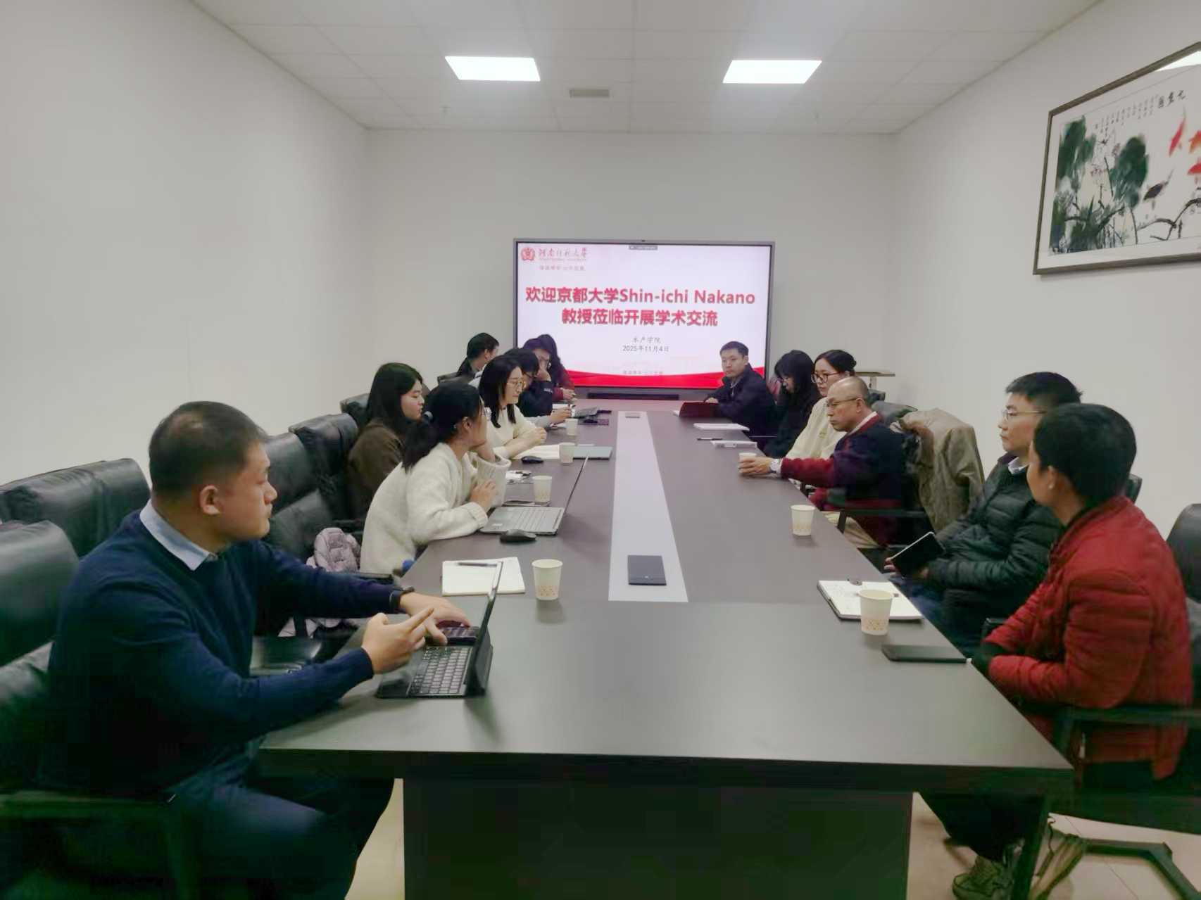 团队师生与京都大学生态研究中心中野伸一教授座谈交流11月4日上午,水域生态学团队部分师生与京都大学生态研究中心中野伸一教授在东区实训楼205会议室座谈交流。座谈会由高云霓副教授主持,团队教师董静、高肖飞、张景晓、朱朋辉、袁华涛等分别从浮游生物、底栖生物、微生物生态方面向中野教授介绍了目前团队开展的各项工作,中野先生详细介绍了日本琵琶湖从1960s至今在水质、浮游和底栖生物群落的长时间变化过程。随后,双方进行了深入讨论交流,为团队开展的水生态监测、评价和保护相关工作提供借鉴和启示。