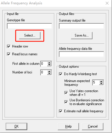 “Number of loci”根据情况而定,该文件只有5对标记,故调为“5”;