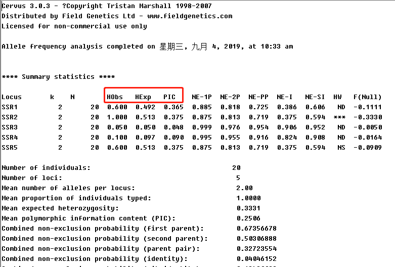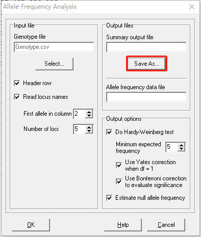 “Number of loci”根据情况而定,该文件只有5对标记,故调为“5”;