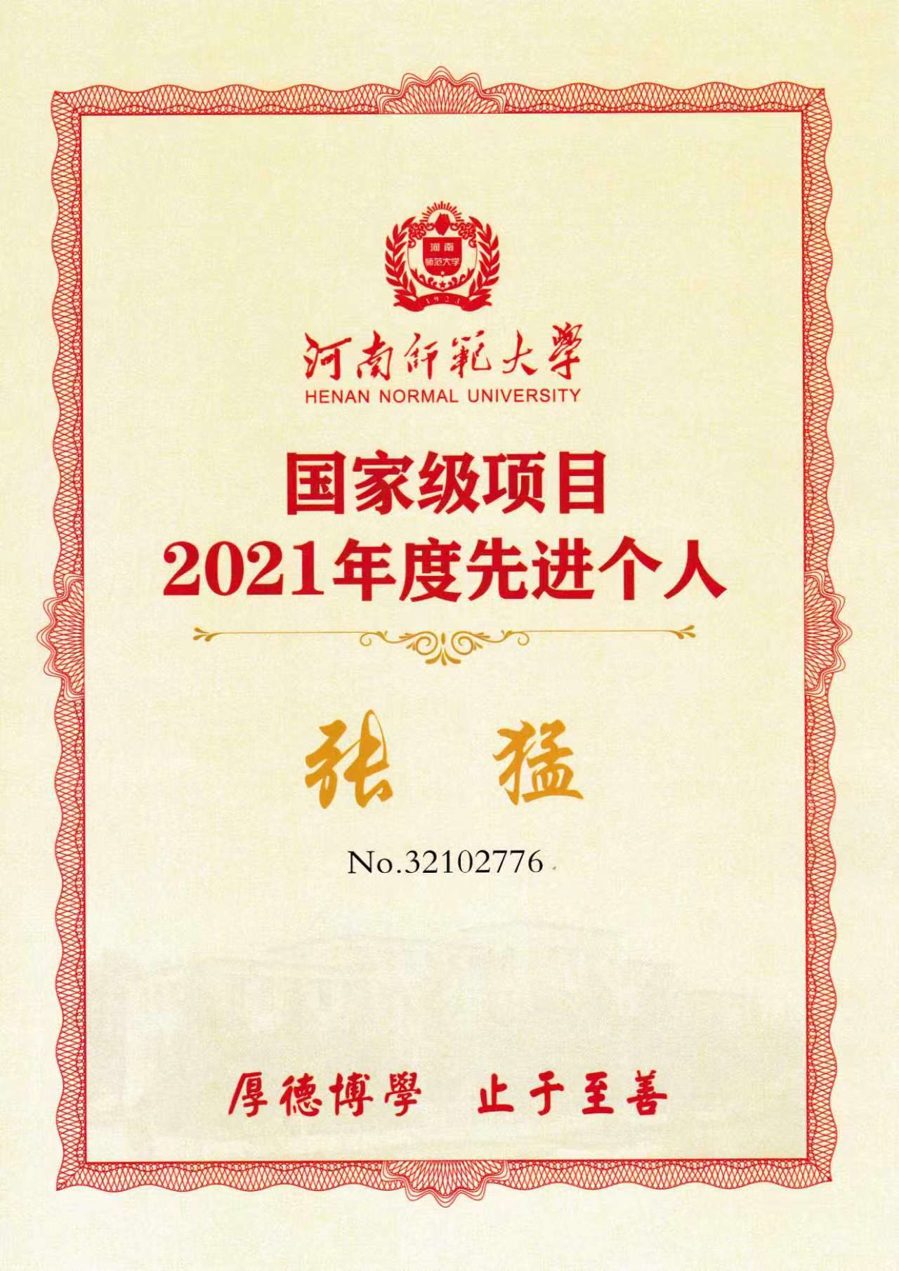 团队张猛老师荣获河南师范大学颁发的“国家级项目2021年度先进个人”