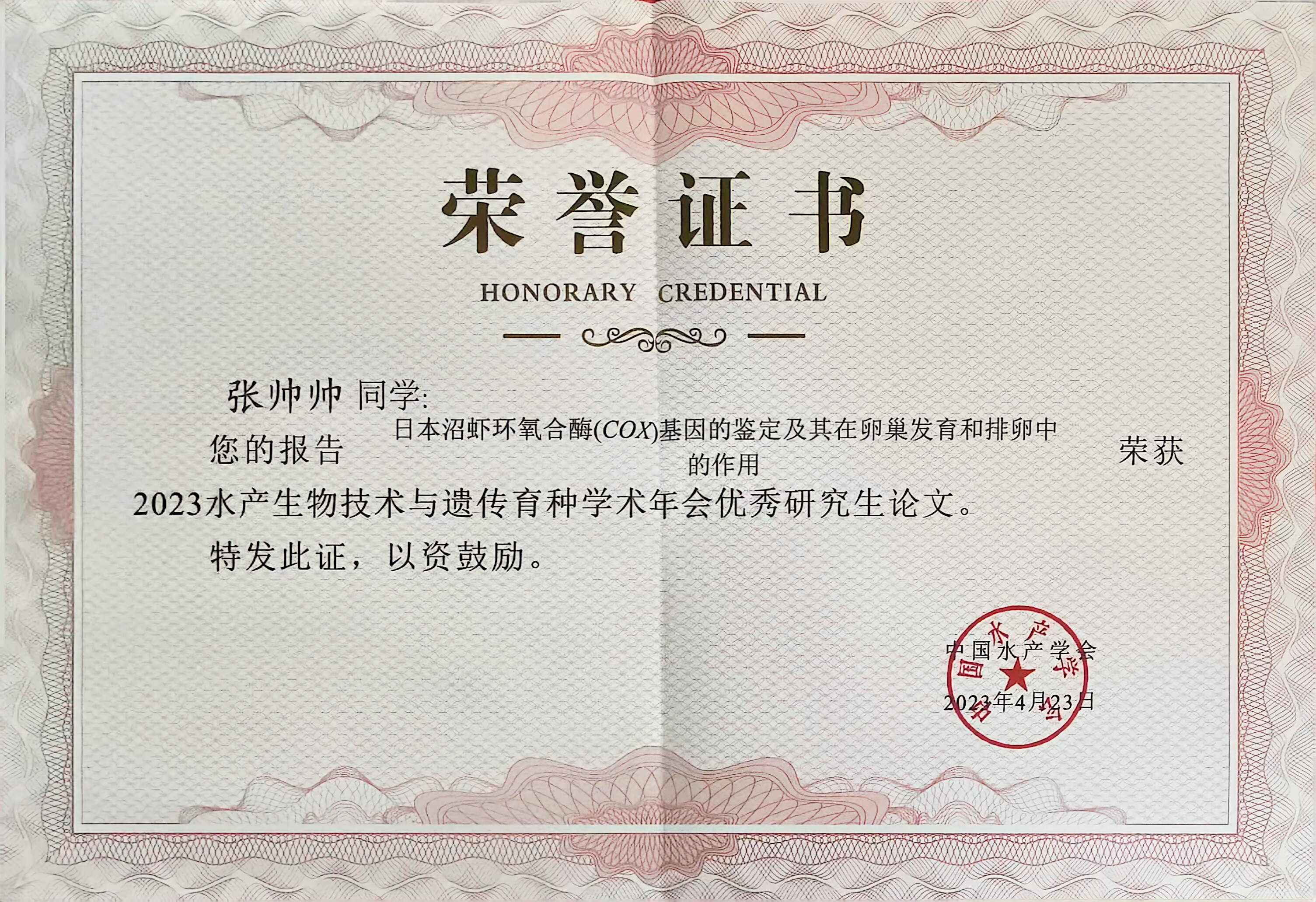 张帅帅同学荣获2023年水产生物技术与遗传育种学术年会优秀研究生论文