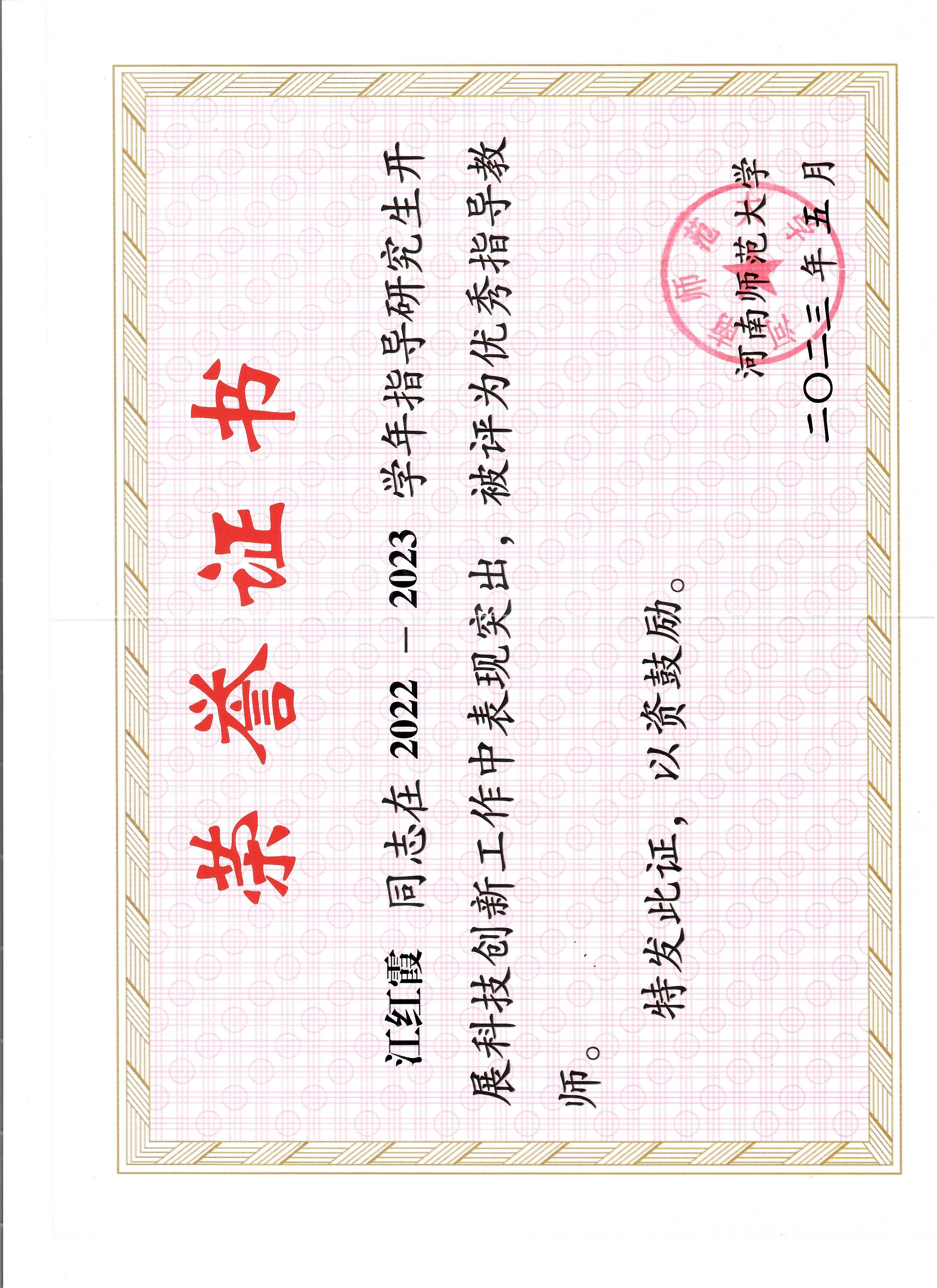 江红霞老师在2022-2023学年指导研究生开展科技创新工作中被评为优秀指导教师