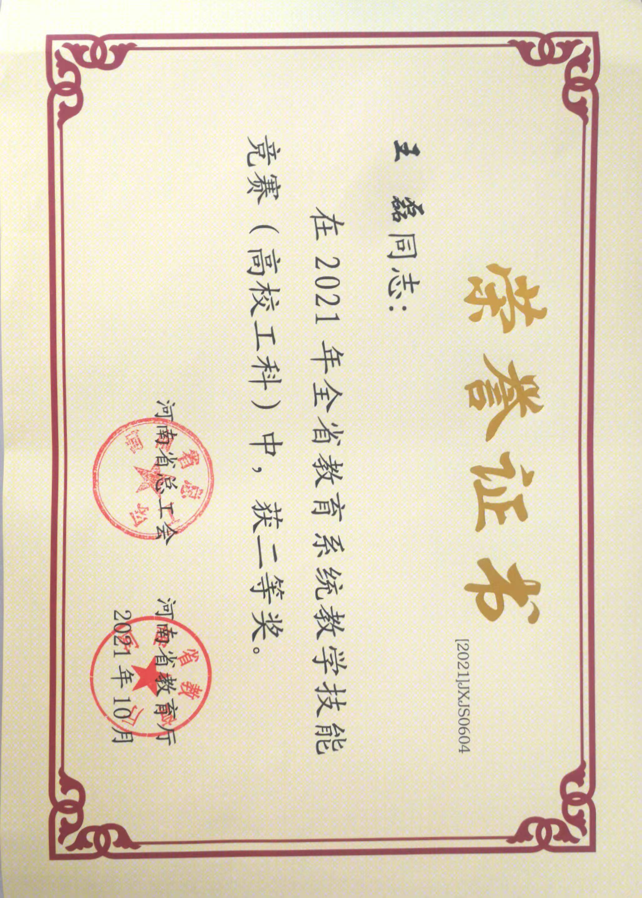 恭喜王磊老师在2021年全省教育系统教育技能竞赛中,获二等奖