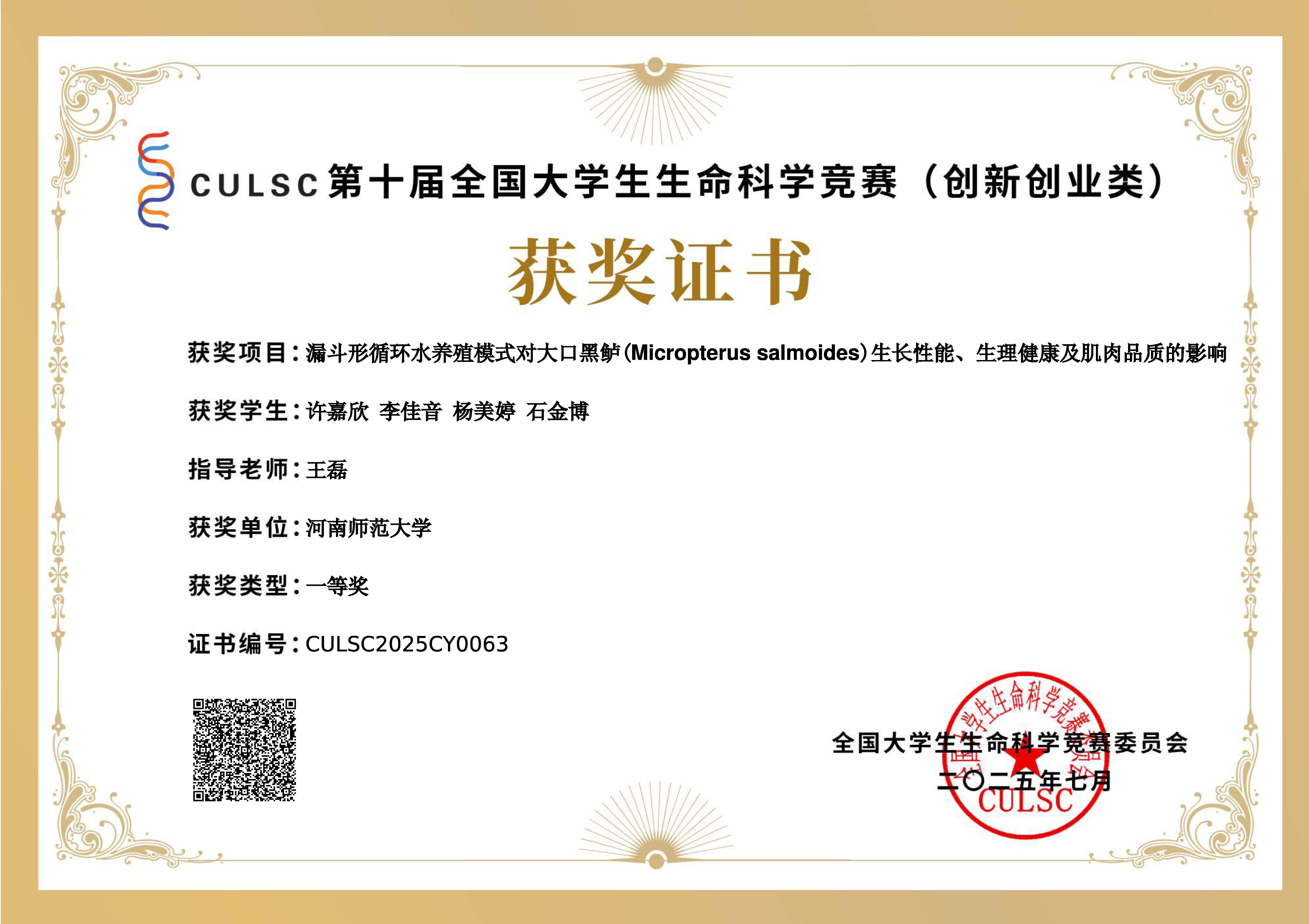 王磊老师所指导学生荣获第十届全国大学生生命科学竞赛一等奖