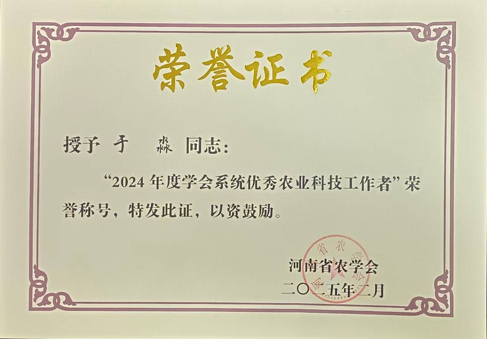 恭喜于淼老师获得河南省农学会“2024年度学会系统优秀农业科技工作者”称号