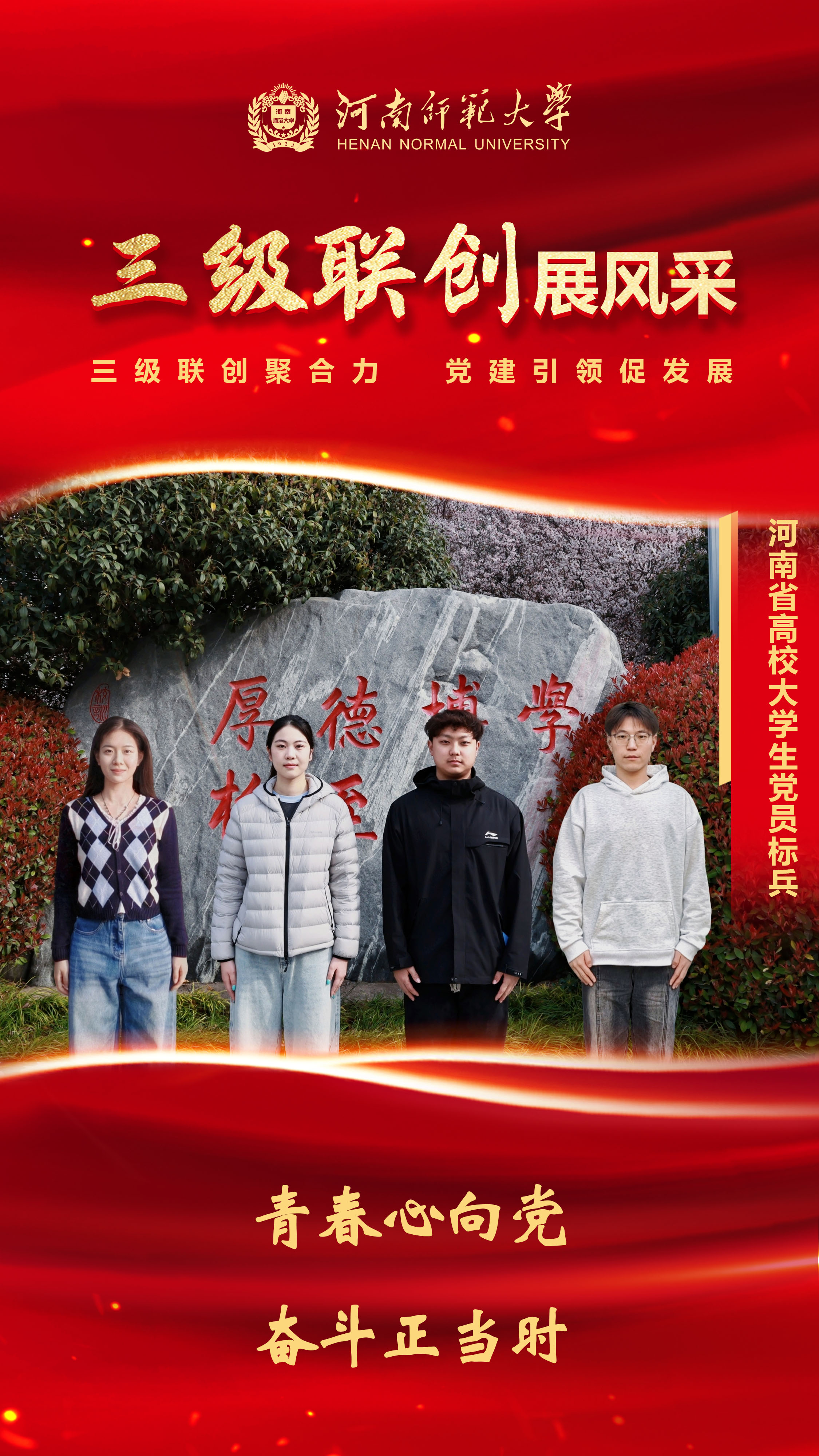 • 【编者按】习近平总书记指出:“基层是党的执政之基、力量之源。”党的基层组织是党的全部工作和战斗力的基础。基础不牢、地动山摇。为进一步推进学校强基引领“三级联创”工作和“党建引领基层高效能治理”专项行动,落实新时代党的建设总要求,树立和践行正确政绩观,全面梳理基层党建工作新思路、新做法、新成效,不断增强基层党组织组织力、凝聚力、战斗力,积极推动党建工作与事业发展深度融合,持续营造比学赶超、创先争优的浓厚氛围,校园网特推出“三级联创展风采”栏目,总结交流和宣传推广基层党建工作成效,充分发挥先进基层党组织引领示范、辐射带动作用,努力推动党建工作再上新台阶。红色传承,奋斗青春。近日,根据《关于开展第三批全省高校“大学生党员标兵”选树活动的通知》(豫教工委办〔2025〕19号)要求,在各高校遴选、推荐的基础上,省委教育工委组织专家,对各高校党委推荐的“大学生党员标兵”人选进行了评审,经过层层选拔,我校徐展、陈虹兆、马卓媛、李一航四名同志获评全省高校“大学生党员标兵”荣誉称号。个人简介徐展,商学院2023级硕士研究生,2019年12月加入中国共产党,现为河南师范大学商学院2023级应用经济学专业在