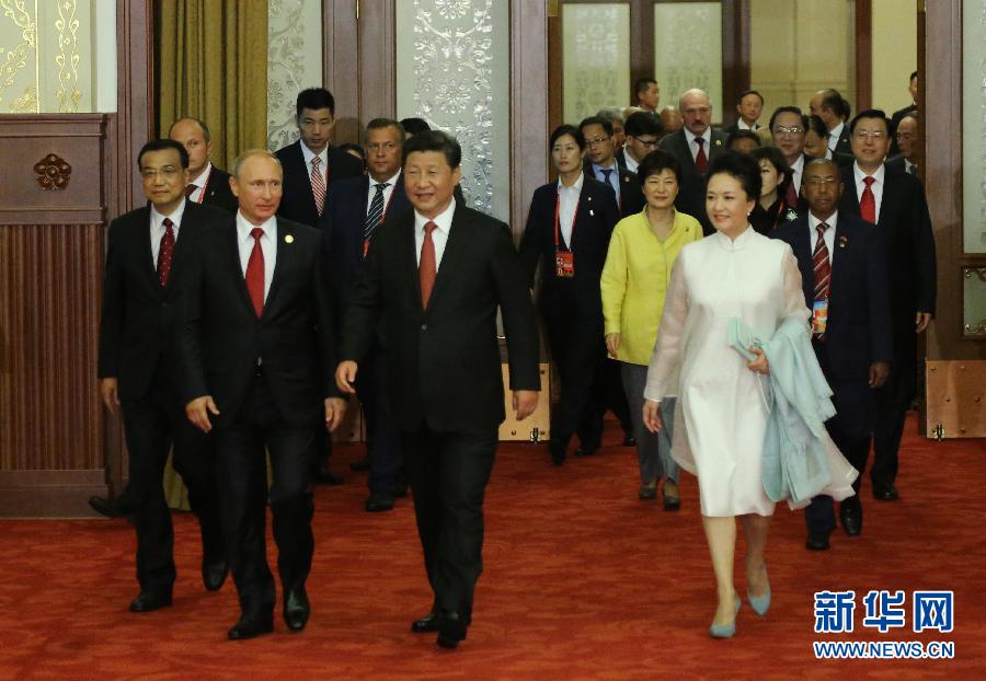 9月3日,纪念中国人民抗日战争暨世界反法西斯战争胜利70周年招待会在北京人民大会堂隆重举行。中共中央总书记、国家主席、中央军委主席习近平出席招待会并发表重要讲话。这是习近平和夫人彭丽媛同参加招待会的外国领导人共同步入宴会厅。