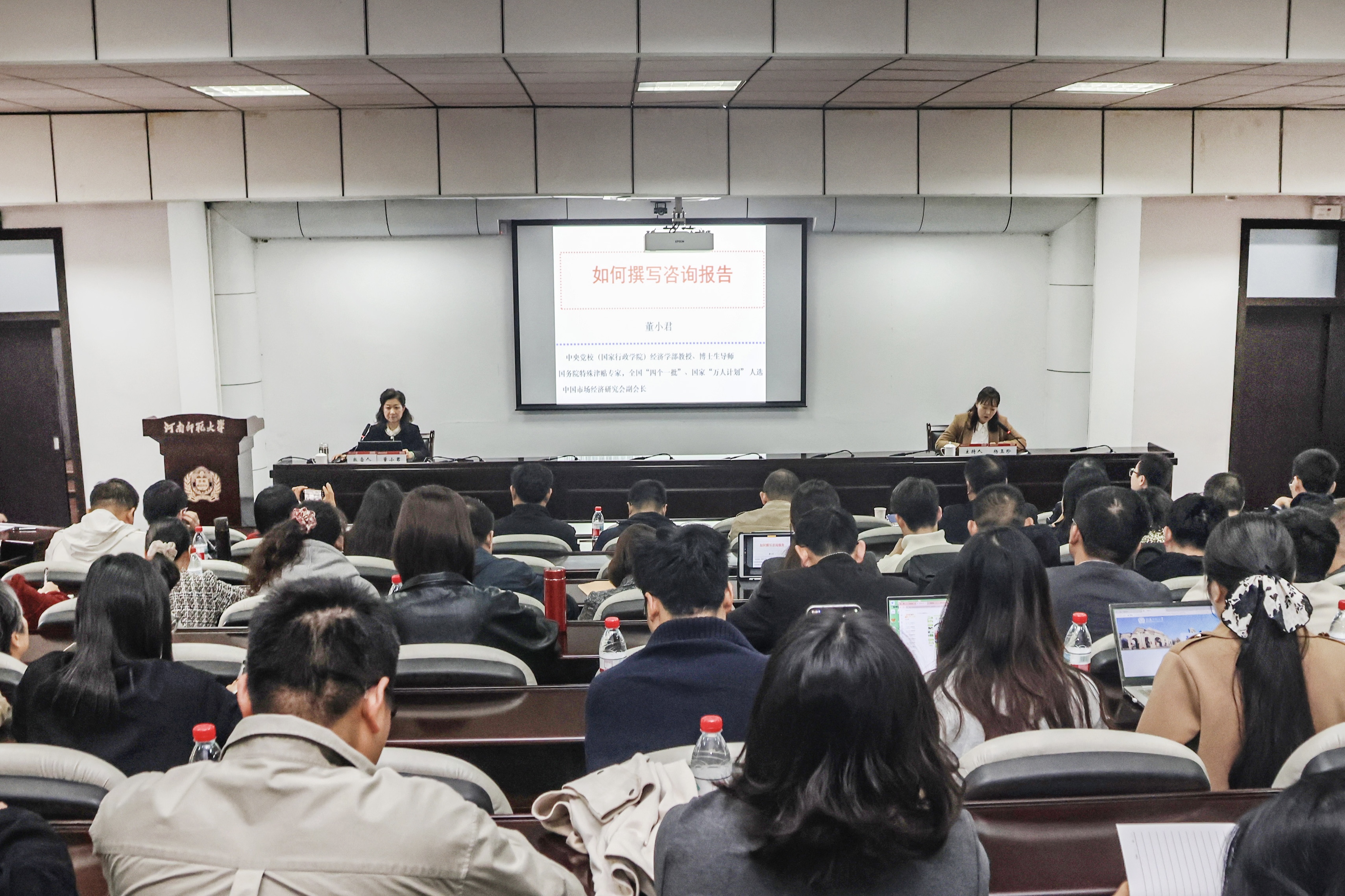 为进一步提升学校咨政服务能力,促进高质量决策咨询类成果产出,10月15日上午,中央党校(国家行政学院)经济学教研部副主任、博士生导师董小君教授应邀为我校师生作“如何撰写决策咨询报告”专题报告。校党委常委、副校长杨玉珍主持报告会。 董小君从决策咨询报告如何选题、如何行文、如何设计可操作性对策建议等难点入手,结合大量鲜活案例,系统剖析了决策咨询报告的撰写策略,重点介绍了进行超前判断、聚焦重大问题等选题方法和切入点,不同类型决策咨询报告的结构、文风和表达方式。整场报告会语言生动、案例丰富,对我校教师如何有效开展决策咨询研究、提升咨政谏言能力具有很强的指导意义。 杨玉珍在主持时指出,专题报告既有理论高度又紧密贴合工作实际,论述精辟、见解独到,具有很强的启发性、指导性与可操作性。希望我校广大科研工作者掌握好科研咨政的理念和方法,力争多出高质量咨政成果,发挥好高校教师建言献策的作用。 专题报告会是学校强化智库建设、提升社会服务能力的重要举措,下一步,学校将强化学术研究与决策咨询深度融合,着力构建具有师大特色的新型智库体系,为服务地方经济社会发展和政府决策贡献更多师大智慧。