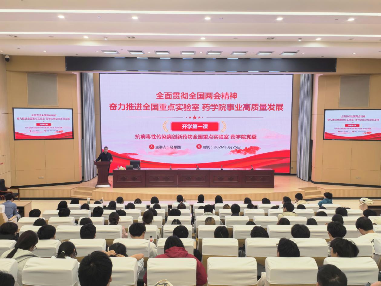 3月25日下午,为全面落实《中国共产党思想政治工作条例》有关要求,按照校党委宣传部《关于开展2026年春季开学思政第一课的通知》统一部署,全国重点实验室药学院党委在求真楼5楼东报告厅组织开展2026年春季开学思想政治教育开学第一课,2025级制药工程专业全体本科生,本科生辅导员参加。