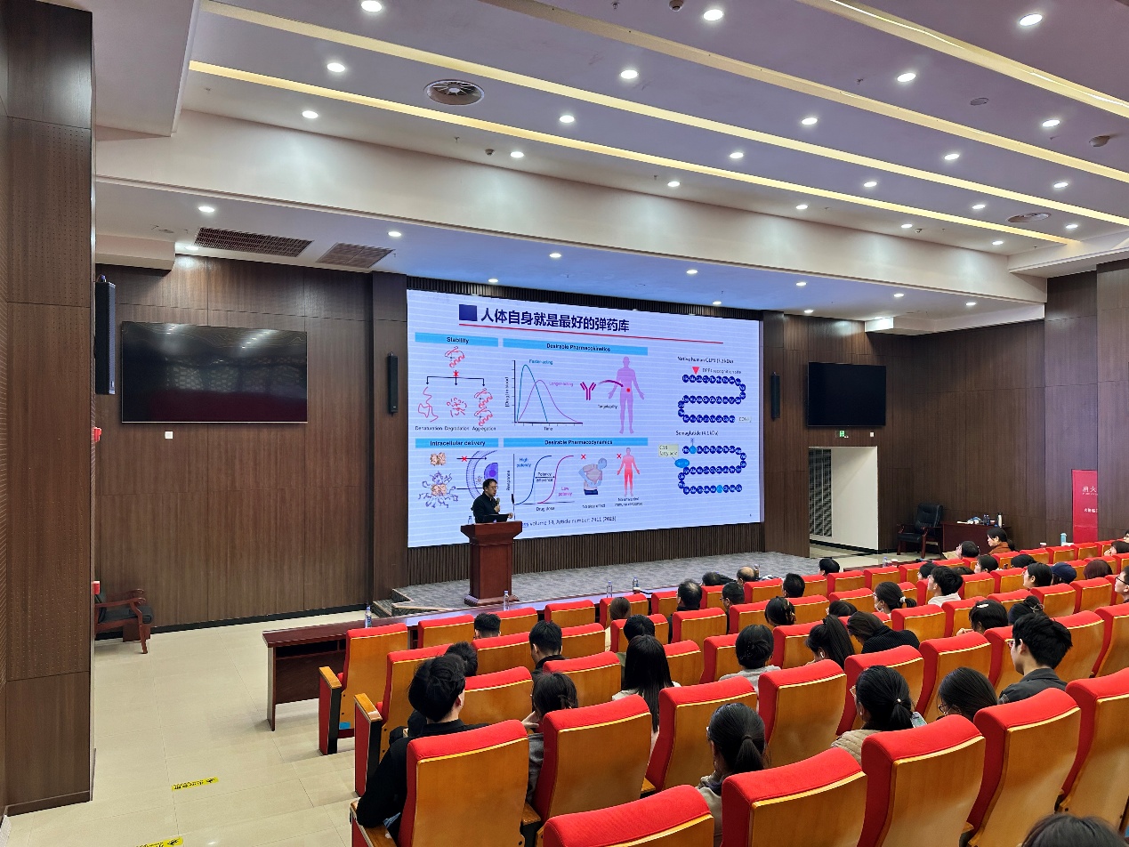 报告中,刘涛教授系统阐述了基于细胞工程与酶工程技术拓展非天然氨基酸结构与功能的研究思路,通过精准化学修饰解决蛋白质成药性难题,推动蛋白质、病毒及细胞等生物技术药物的升级换代与创新,并探索其在肿瘤及炎症生物诊疗中的应用。在互动交流环节,刘涛教授逐一细致解答师生提问,并就研究细节与大家进行了深入讨论。