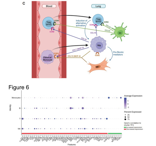 7、提出了特发性肺纤维化中肺-血募集模型,并预测单核细胞与淋巴细胞变化中的基因标志物