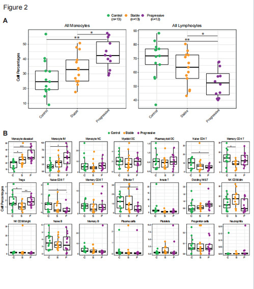 作者在对照、稳定和进展的样本中检测到细胞类型丰度的变化。具体变化为所有单核细胞(对照组为27.1%,稳定期为33.5%,进展期为43.3%;图2A)、典型单核细胞(17.9%、25.2%和32.1%;图2B)和中间单核细胞(1.9%、3.0%和4.7%)的平均计数逐渐增加。非经典单核细胞在三组间差异无统计学意义。与单核细胞的增加相反,淋巴细胞(T、B和NK)的水平呈现逐步下降的趋势(69.5%、62.6%和52.6%;图2A)。T淋巴细胞的显著变化包括进行性IPF中幼稚的CD4和CD8T细胞以及效应性T细胞的减少(图2B)。相反,进展期与稳定期相比,调节性T细胞(Treg)增加(1.8 %vs 1.1%,p=0.007)。