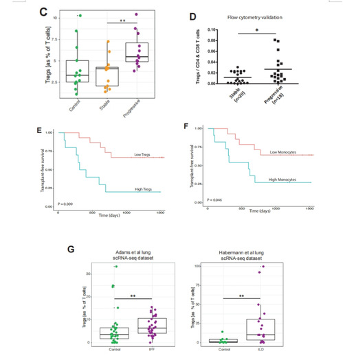 作者发现进展性IPF患者与稳定期IPF患者,在外周血中Tregs的百分比(图2B)和在所有T细胞中Tregs的百分比图(4C)均升高。同时在流式细胞仪数据集中检测了以CD_4+和CD_8+T为主的Tregs细胞百分比(4D)。并在特发性肺纤维化患者队列中得到了验证,表明Treg水平可能具有预后意义:Treg计数较高的患者的死亡率明显较高(图4E)。这与单核细胞水平的生存曲线相似,单核细胞水平被认为是预后的指标(图4F)。根据这一观察,作者重新分析了肺组织中的scRNA-seq数据集,发现进展性纤维化肺与对照肺相比Tregs增加(图4G)。进展期患者外周血中TREG激活途径(转化生长因子β/SMAD、mTOR和IL-2途径)基因表达增加,干扰素γ途径降低。这些发现表明,在进展性IPF患者中,激活的Tregs可能从血液中招募到病变肺中,并与预后相关。