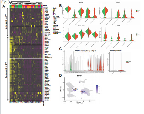 与对照组相比,IPF组的单核细胞群中PPBP(血小板基因)的表达增加,受试者之间存在差异(图3C-D)。当血小板被激活时,可能会与单核细胞黏附,产生血小板-单核细胞复合体。在外周血单核细胞数据中发现了两簇血小板-单核细胞复合体,可能反映了IPF中血小板活化的增加,与单核细胞的粘附性增强。此外,在肺scRNA-seq的两个数据集中,肺纤维化组的单核细胞和巨噬细胞的PPBP水平也高于对照组。