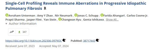2024年5月8日,耶鲁大学医学院团队在American Journal of Respiratory and Critical Care Medicine杂志发表了题为《Single-cell profiling reveals immune aberrations in progressive idiopathic pulmonary fibrosis》的研究论文,证明了IPF患者血浆和肺组织匀浆中可能涉及单核细胞的趋化物质和Tregs募集增加,提出了IPF存在肺-血免疫募集模式。