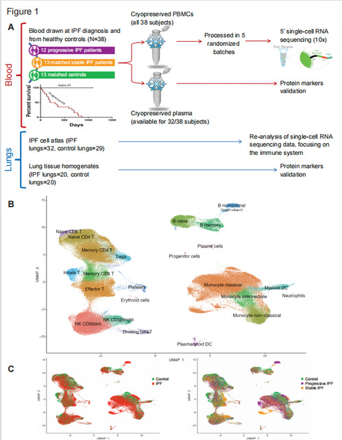 特发性肺纤维化(IPF)是一种慢性间质性肺疾病,可导致进行性肺疤痕形成和患者死亡。每一种免疫细胞类型都被认为在这种疾病中起作用,包括单核细胞、巨噬细胞、T细胞和B细胞,但免疫抑制治疗增加了IPF患者的死亡率。因此免疫系统在IPF中的作用尚未完全解决。随着单细胞技术的发展,将此技术应用于肺纤维化患者的组织中,获得了实质性的结果,并发现了肺中免疫细胞数量的变化,但仍缺乏外周血液中的变化。本文作者通过对肺纤维化中外周血单核细胞(PBMC)进行单细胞测序分析,提供了IPF外周血免疫系统的图谱。