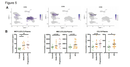图5B显示了在IPF血浆中发现增加的三种主要趋化因子。在四种MCP中,CCL7(MCP-3)显示,无论是稳定性患者还是进展性患者,IPF血浆水平均显著高于对照组。对于CCR4配体,血浆CCL22水平有升高的趋势,无论是IPF组与对照组,尤其是进展性IPF组,而CCL17水平无明显变化。与对照组相比,IPF肺组织匀浆中CCL22水平显著升高。CCR8配体包括CCL1和CCL18,CCL1在IPF血浆中没有升高,发现了IPF患者的CCL18比对照组升高。