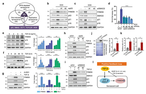 作者在DOX诱导的衰老细胞中敲降p53和SMAD可以抑制p21、p16的表达和SA-β-gal的活性,这证实它们在衰老过程中的作用。TGF-β激活SMAD2/3与SMAD4形成复合物以激活SMAD依赖性基因。值得注意的是,p53与SMAD相互作用,协同驱动PAI-1的转录。TGF-β以剂量和时间依赖性上调FRMD6的表达。A-8301(TGF-β受体抑制剂)可以抑制TGF-β诱导的FRMD6和衰老标志物的水平。在TGF-β诱导的衰老细胞中,敲降p53和SMAD2显著抑制FRMD6、p21和p16的蛋白表达。随后,通过免疫印迹和ELISA结果显示过表达FRMD6可导致TGF-β分泌增加并且也可检测到IL-6 and IL-8的分泌。总之,TGF-β上调FRMD6,FRMD6可导致衰老并促进TGF-β的分泌。