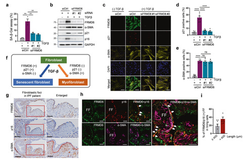 作者研究FRMD6的特定作用。首先,敲降FRMD6可减少SA-β-gal阳性细胞的数量并且还抑制TGF-β诱导的p21和p16水平升高,α-SMA水平未受影响。作者猜测FRMD6可能特异性参与衰老但与肌成纤维细胞分化无关。为了证实这一点,作者对FRMD6、p21和α-SMA进行三重染色。结果显示,TGF-β处理上调FRMD6并与对照细胞中的p21重叠。敲降FRMD6后,α-SMA显著降低但p21的表达水平未受影响。结果表明,FRMD6是TGF-β诱导IMR90细胞衰老的关键因素。接下来,作者检测FRMD6在纤维化环境中的表达情况。通过免疫荧光结果显示,FRMD6在纤维化区域高表达并与p16共定位,但与α-SMA不共定位。